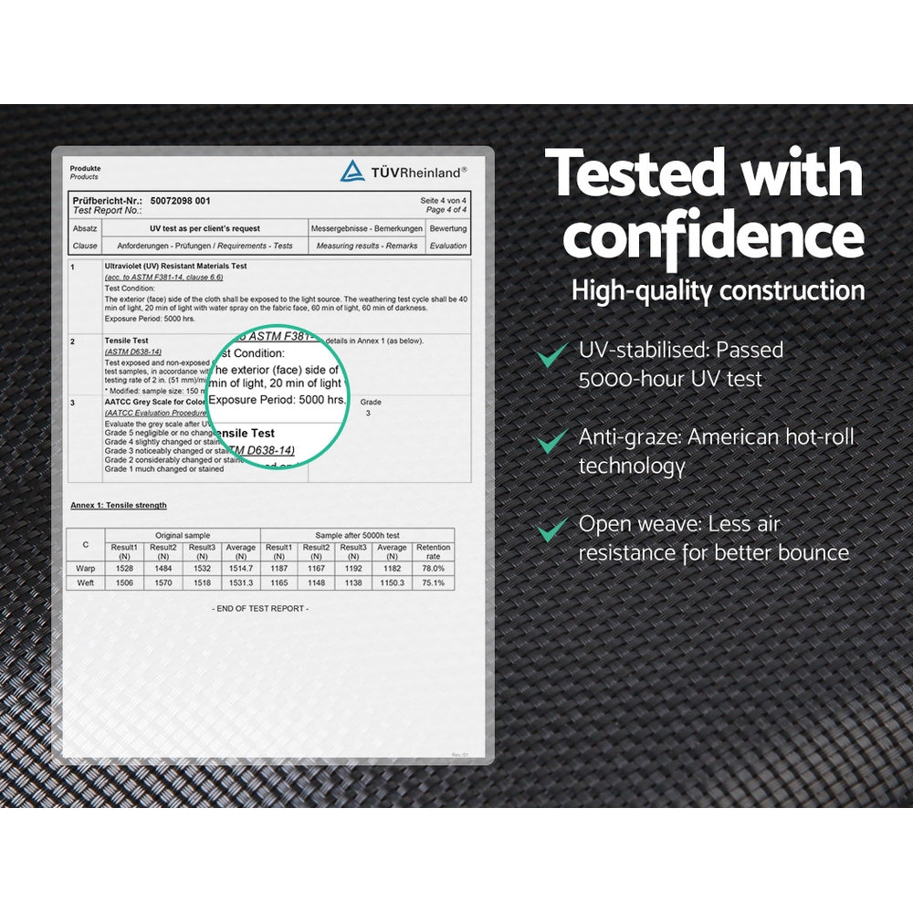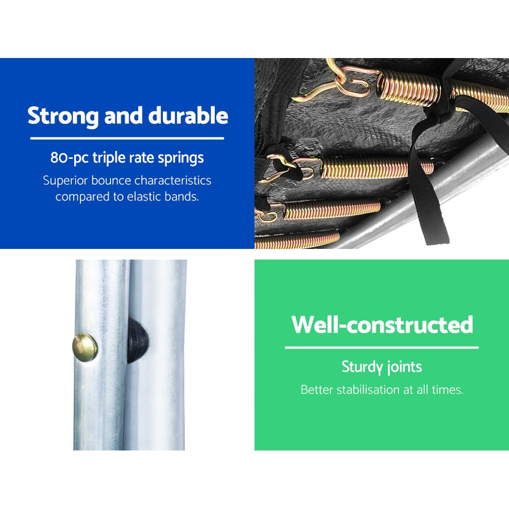 Bounce to your heart's content with the Trampoline. With its superior bounce characteristics featuring 80-piece triple rate springs, the 14-foot Trampoline enables safe and durable bouncing with no worries. The heavy-gauge steel framework is designed to handle all robust play and is UV-tested for quality and reliability. Other great features include a curve design for more rigidness, 20mm thick padding, anti-graze mat, safety netting and a double-lock zip-and-clip entry. Not least, the included basketball hoop, basketball and pump really adds an awesome fun factor to the entire ensemble. So jump to it and order the Trampoline today.