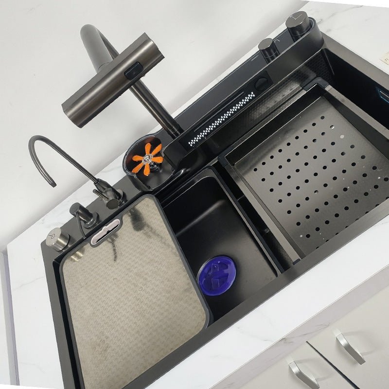 HIGH-QUALITY MATERIAL:This waterfall kitchen sink is newly released to the market. It is made of high-quality 4mm 304-grade stainless steel for excellent hardness and durability. The kitchen sinks adopt nano-coating finish, which is anti-rust, durable and long-lasting. Wipe clean for easy maintenance.