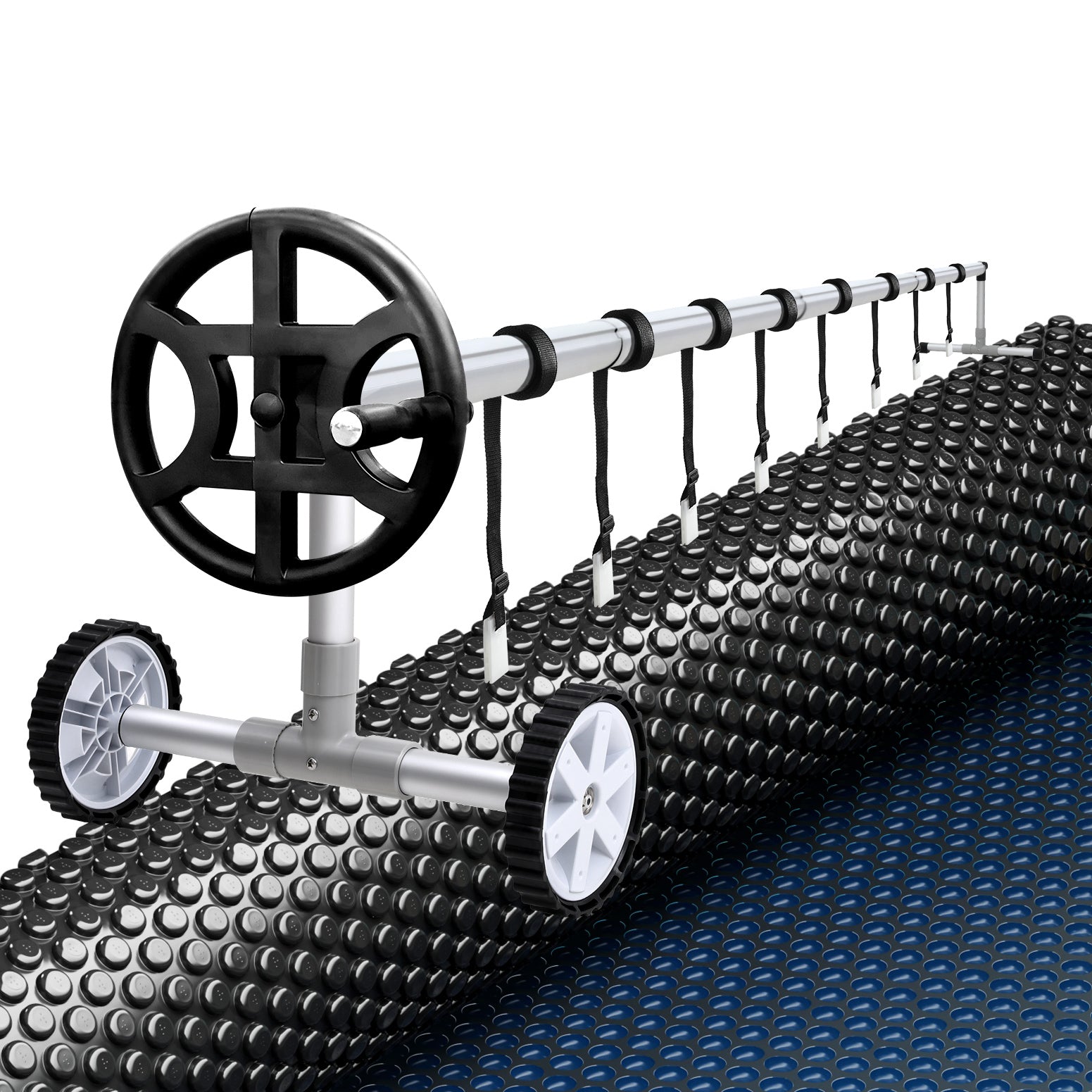 Keep your pool protected and well-maintained with the AquaBuddy Pool Roller and Pool Cover Set, designed for convenience, and efficiency. The pool roller features an aluminium construction with fully adjustable telescopic poles, making it easy to fit pools of various sizes. Its low-friction crank wheel and non-slip spinning wheel design ensure easy rolling and unrolling of the cover, while the blanket security lock keeps it in place. Heavy-duty securing straps and buckles provide added stability.
