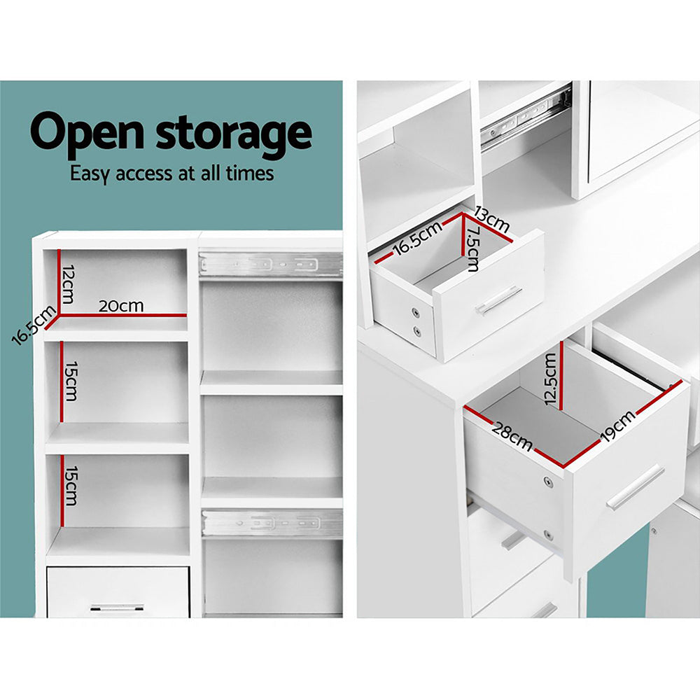 Beauty is in the eye of the beholder. And our Artiss Dressing Table Set is definitely a beauty to behold. Made of sturdy particle board with melamine finish, the dressing table is embellished with many practical features. Behind the sliding mirror lies hidden storage shelves for personal essentials. Plus, the three open shelves also provide a myriad of display space for all your makeup, fashion accessories and more. The dressing table also comes with five drawers of various sizes for extra storage options, with the main drawer being lockable. It offers ample legroom too for you to groom with minimum hassle and a well-padded stool completes the ensemble. Not least, the smooth and impeccable white finish makes for an easy blend with any decor as well as hassle-free maintenance. Create your own personal styling zone with our beautiful and functional dressing table set.