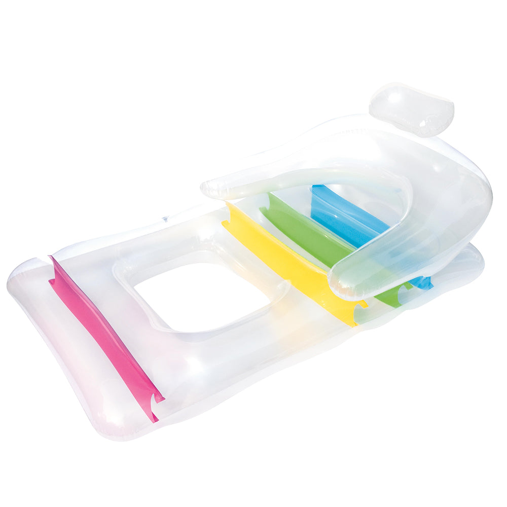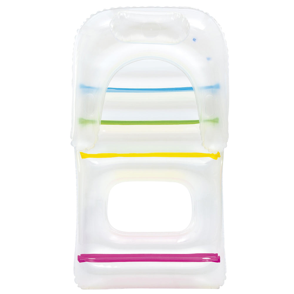 Kick back and chill out on your pool with our Bestway Inflatable Lounge. With its see-through design and colourful interior, our inflatable lounge is guaranteed to provide you plenty of aquatic fun and relaxation. Made from sturdy pre-tested vinyl and a colourful I-beam construction, the inflatable lounge is durable and has two leak-proof air chambers. You can float away for hours on end as the headrest, armrests and backrests provides ultimate comfort. The inflatable lounge is made to last for many summers, but should an accidental tear occur, our supplied repair kit should be adequate to patch the fun back with minimum fuss. So, get ready for a fine summer and soak in the sun and sea in fine style with our inflatable lounge.