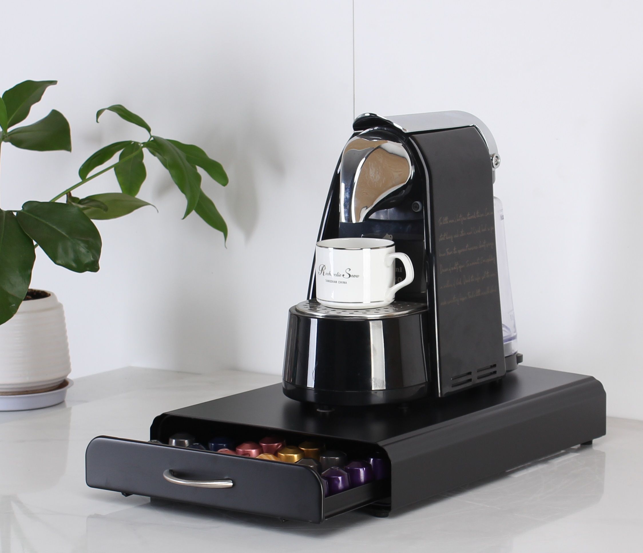 - HIGH QUALITY MATERIAL: drawer made of cast iron steel frame, which is extremely hard and it will protect your coffee capsules perfectly. It could hold a coffee machine and coffee cup easily. The smooth black surface owns good anti-rust ability, which is perfect for kitchen storage & organisation.