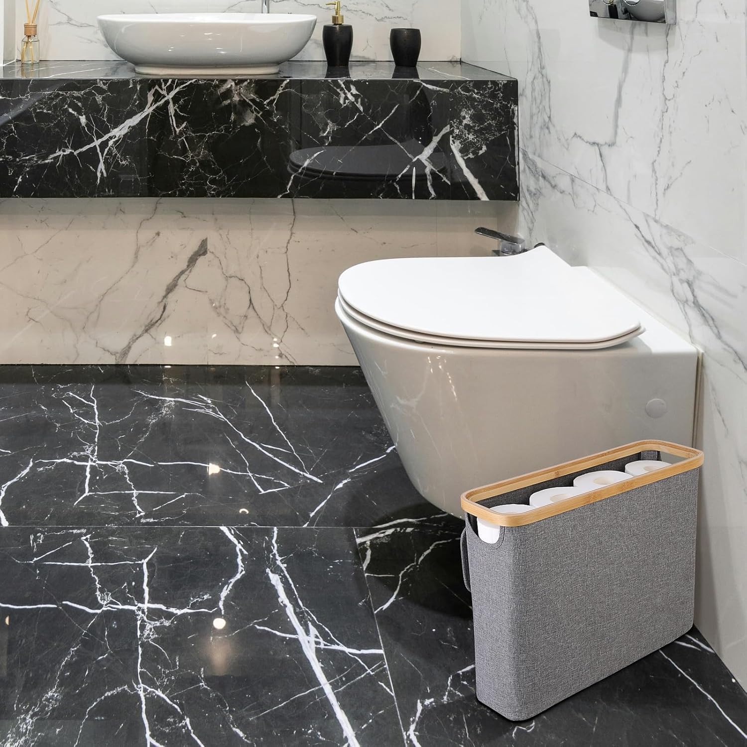 - LARGE STORAGE CAPACITY: This slim basket holds up to 12 regular toilet paper rolls or 9 jumbo rolls, helping you stay fully stocked and organized. A perfect fit for small bathrooms, closets, RVs, or under-sink spaces.