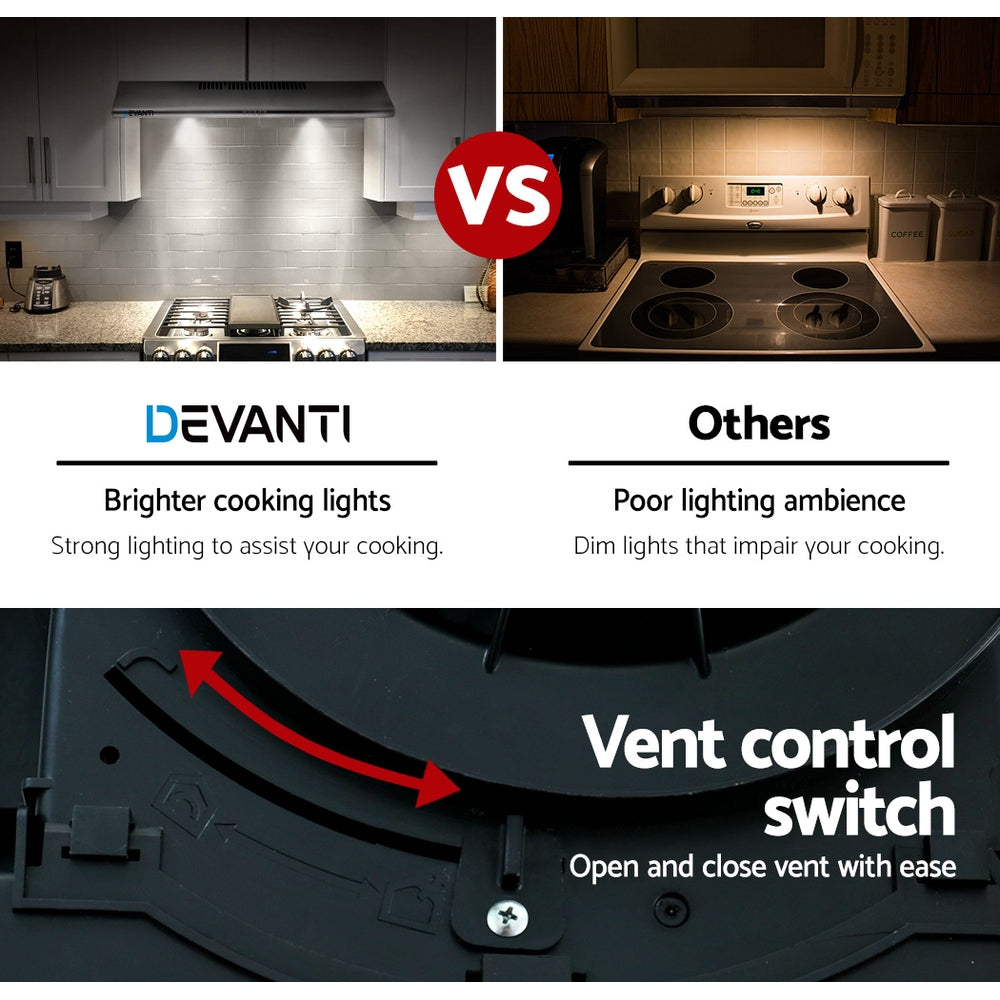 The Devanti Range Hood features an elegant Grade-A stainless steel body that looks as good as it functions. Its ducted design also allows multiple venting options when it comes to installing it. And you can also say goodbye to smoky fumes and unwelcomed cooking odours too. With its high-performance 125W motor, the efficient range hood provides a steady upflow and filtered extraction of fumes and oil to keep your cooktop area clean and fresh after every use. With its 3-speed touch controls, the extraction speed can be adjusted to suit the circumstances. Other features include three non-stick 5-layer aluminium filters that are removable and replaceable and two bright LED lamps to facilitate your illuminated cooking.