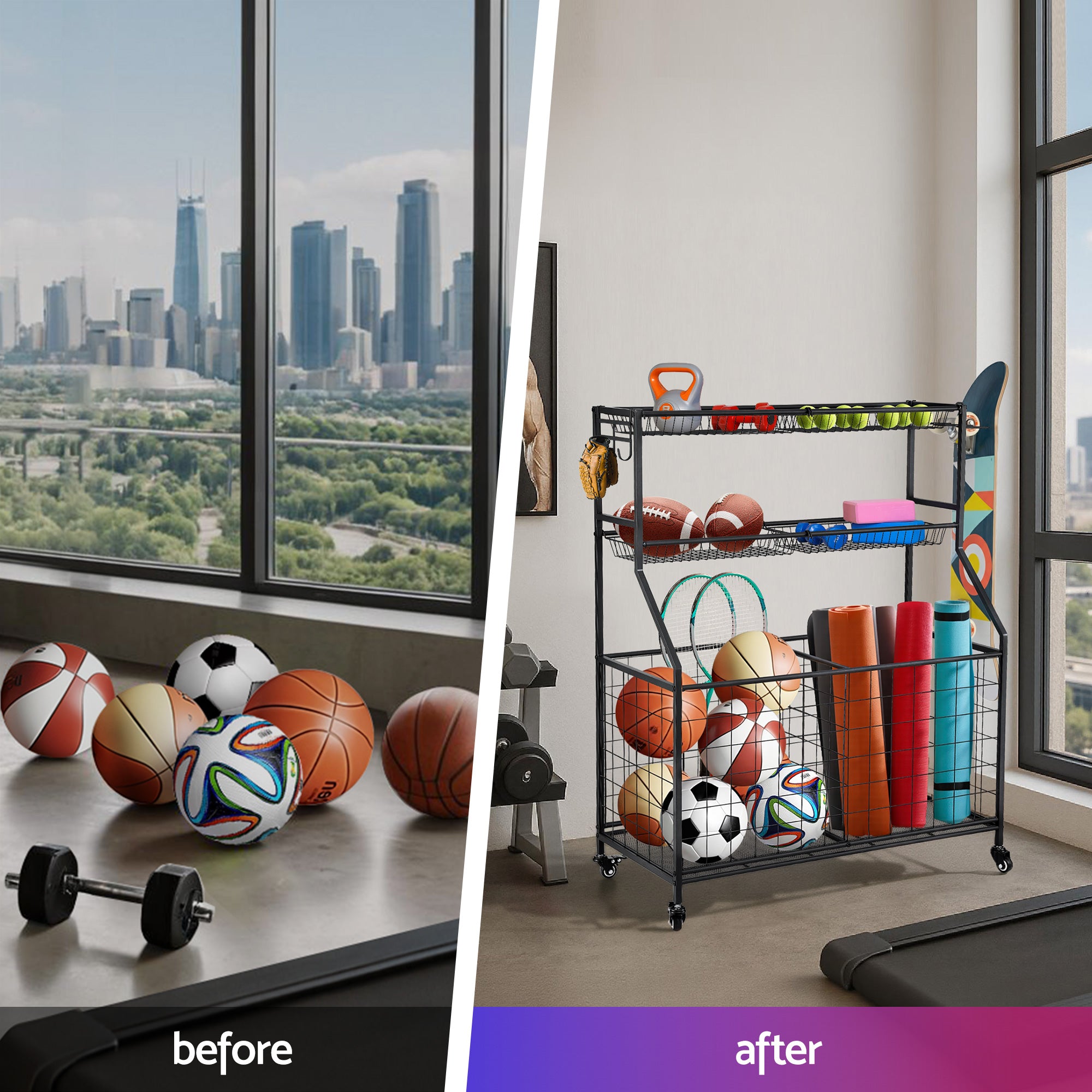 Organize all sports gear with the Everfit Sports Equipment Organizer featuring dedicated compartments for balls, rackets and accessories. The sturdy steel frame with 4 swivel wheels allows easy mobility between garage, gym or backyard. Includes ventilated baskets for airflow and adjustable hooks for equipment. Compact design fits tight spaces while holding up to 80kg. Ideal for basketball, soccer, tennis and more.