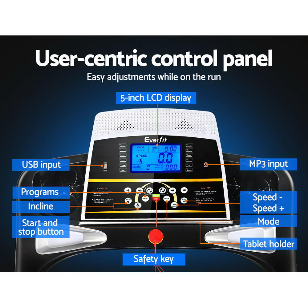 Compact and sturdy with its powder-coated steel frame, the Everfit Electric Treadmill allows you to perform essential cardio exercises within the comfort of your home. It features 12 pre-set training programs designed to simulate natural terrain. A user-centric control panel with a digital LCD display lets you set up to 18 speed levels and other monitoring parameters. Its linear power drive motor produces smooth and seamless operation and the anti-slip belt and soft-grip handle bar with pulse sensors make your session a comfortable and controlled experience. Other great features include a 15-level inclination adjustment, innovative double shock absorption system, automatic motor and belt lubrication, safety tether key and smooth wheels for easy mobility. Not least, the Treadmill is also equipped with a USB and MP3 connection, speakers, dual drink holders and a tablet holder for those who like to workout in style.