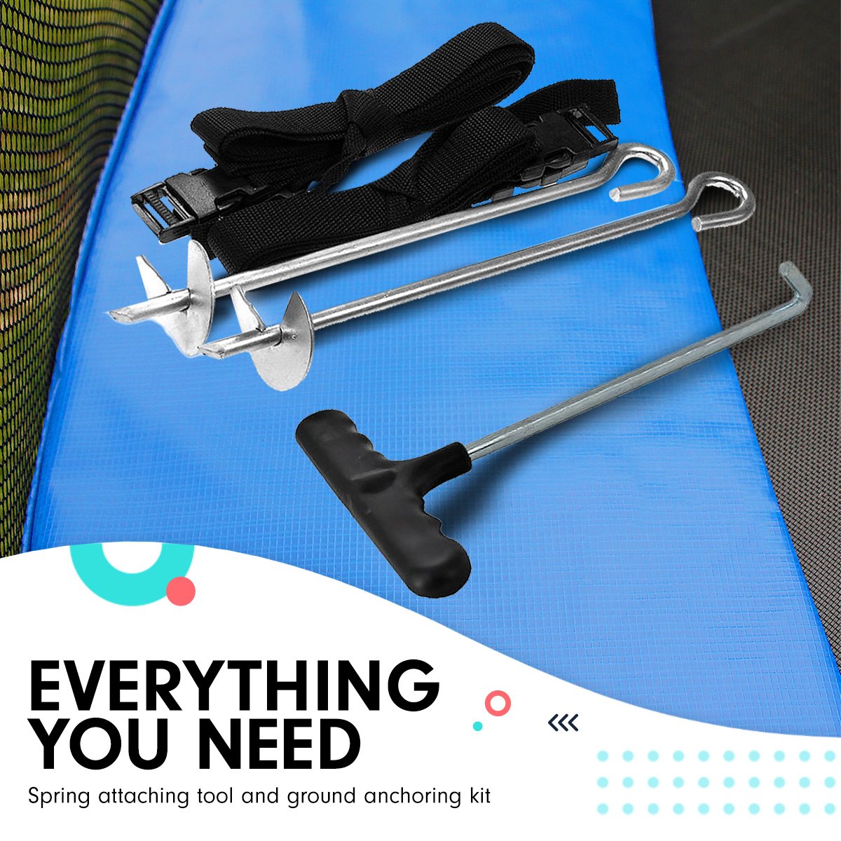 For safe and secure assembly, this trampoline comes with a spring attaching tool and a ground anchor kit. It also includes a bonus ladder and mesh compartment for shoes and other small items. Keep your yard organised while your kids jump and bounce away!