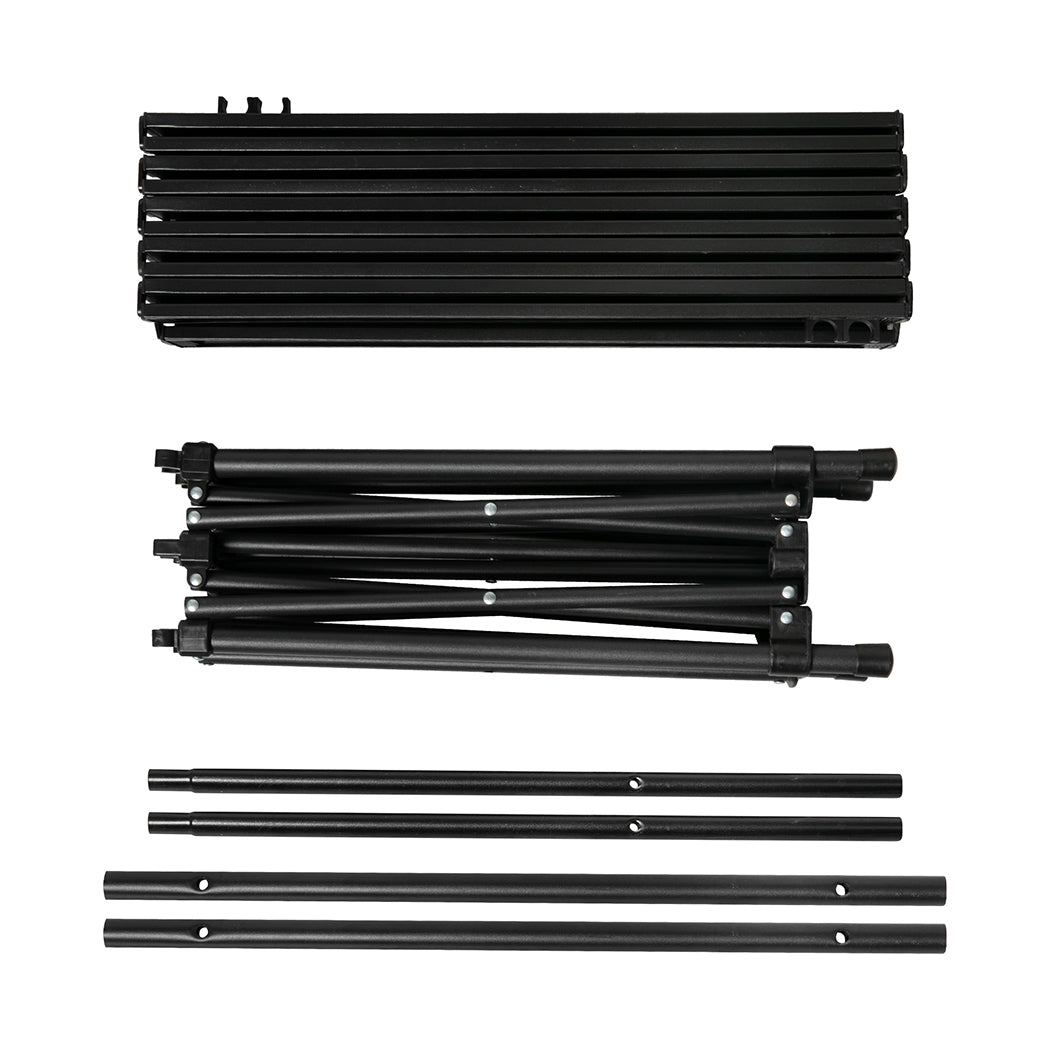 Pull your folding trestle table out of its carry bag. Extend the frame out. Attach the tabletop support beams. Unroll the table onto the beams. Attach the storage net to the legs. Done!
