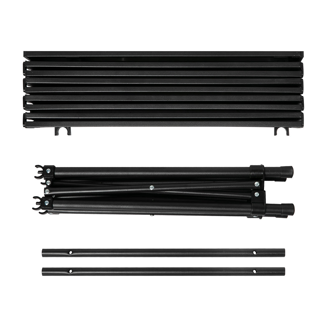 Pull your folding trestle table out of its carry bag. Extend the frame out. Attach the tabletop support beams. Unroll the table onto the beams. Attach the storage net to the legs. Done!