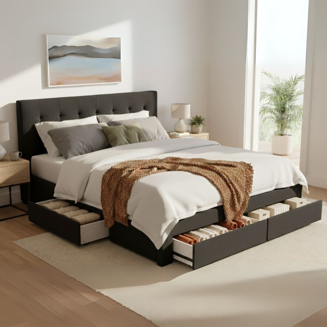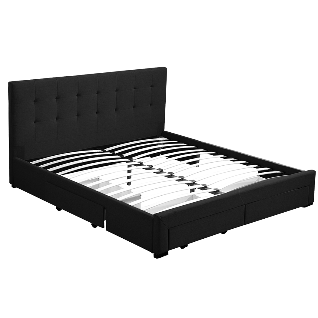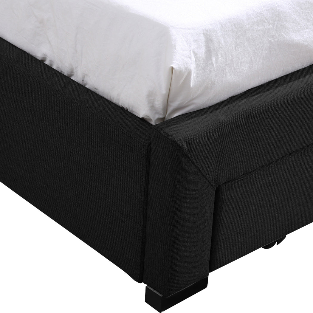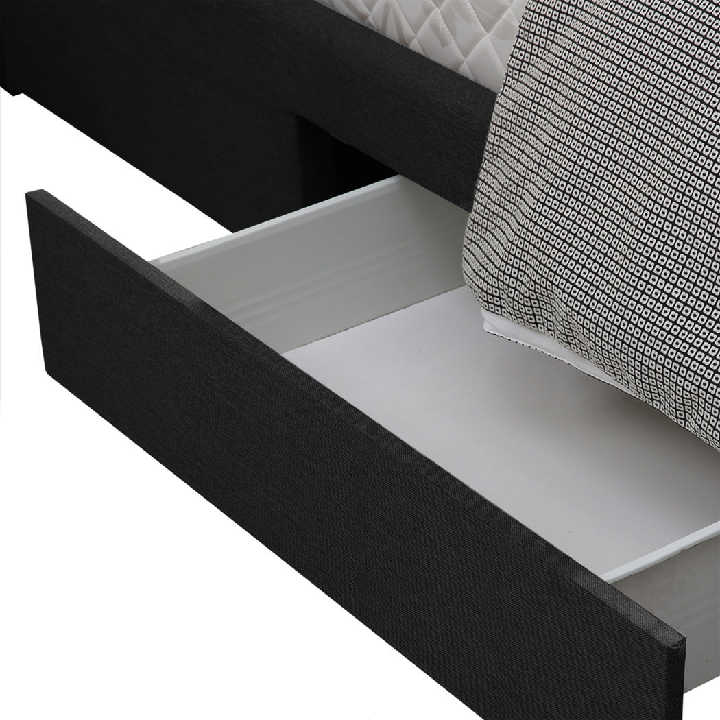 If you're looking to for an attractive bed keep your space clutter-free, our fabric bed with storage drawers is the perfect choice for you. The frame is constructed with a sturdy wood frame that's wrapped with cotton and linen fabric will look stunning in any bedroom in your home. Not only does it provide a stylish place to sleep, but the storage drawers will help you keep your space clutter-free.