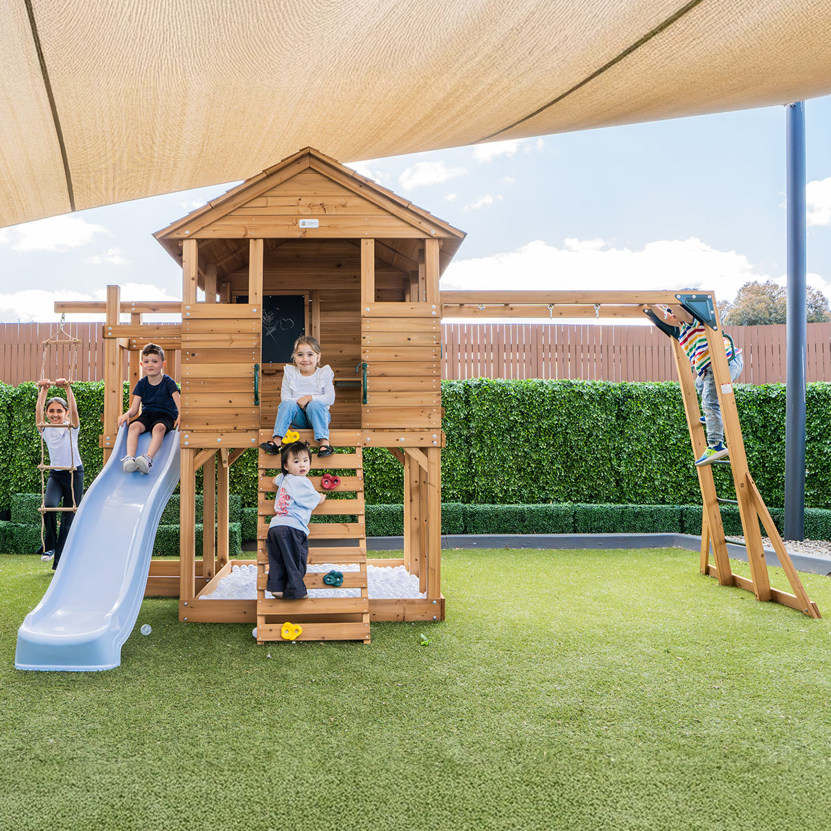 Youngsters will have endless adventures with the Kingston. This beautiful timber play centre cubby house combo will have your little ones entertained for hours, with sandpit, monkey bars, swing set, climbing wall, climbing rope, and slide. Watch their creativity grow with a fun chalkboard and sink included.