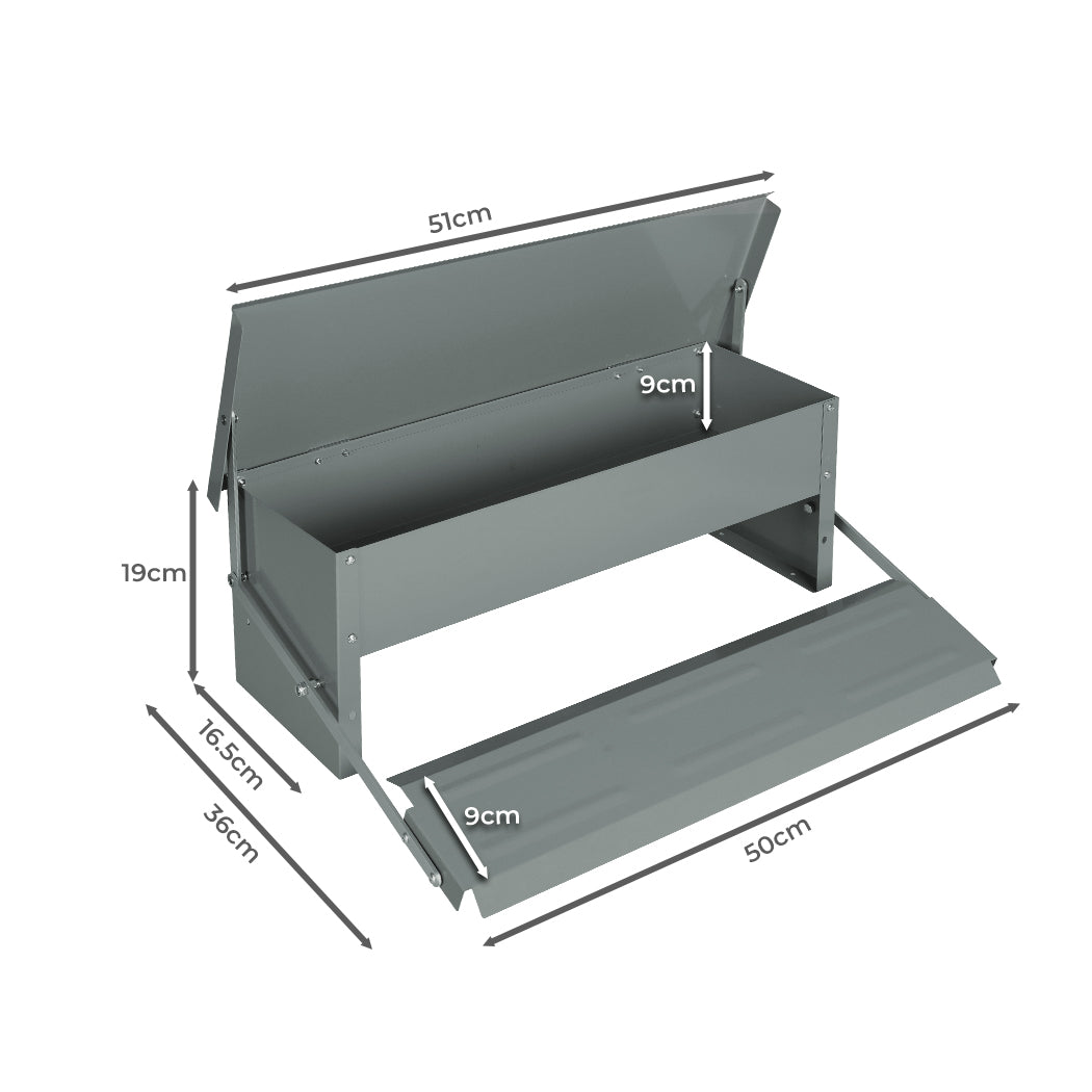 Made from high-quality galvanized iron. A special rust-proof galvanized coating is provided on the entire body to provide active resistance towards the water. Effectively keeps all the food inside clean and fresh. A solid and durable construction helps withstand long term and regular use. Equipped with very large-sized container to hold up to 7.5L of feed. To access the food container a minimum of 500g weight is required. Very easy to assemble with simple instructions. Economic and very low on maintenance.