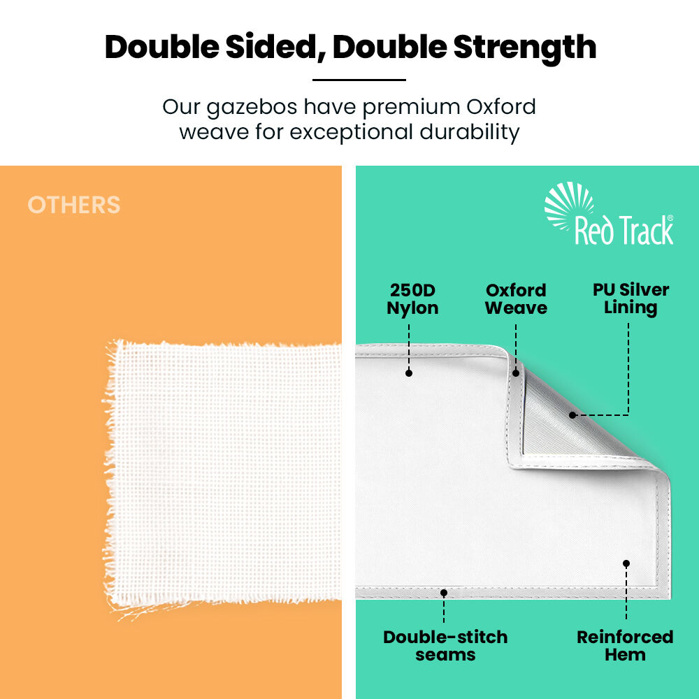 At the heart of the design is Red Track's patented steel-cable reinforced canopy structure, which keeps the roof tight, prevents water from pooling, and adds exceptional wind resilience. Combined with oversized truss bars and square-tube steel legs, this gazebo offers rigidity you can rely on.