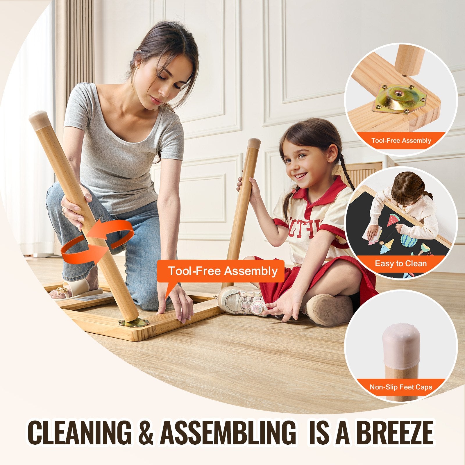 This sensory play table requires no tools for assembly -just need to connect the legs. Equipped with 4 non-slip foot caps, it protects your floors from scratches and reduces the risk of accidental bumps. The smooth surface can be easily wiped clean with a damp cloth, allowing your children draw and create freely.